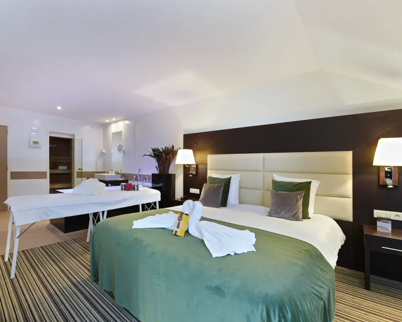 Offrez-vous une expérience de bien-être inoubliable dans notre Wellness Suite, une suite luxueuse à deux étages située dans notre hôtel 4 étoiles à Charleroi. Idéale pour un moment de détente ou un séjour professionnel haut de gamme, cette suite avec sauna privatif et bain à remous est pensée pour conjuguer confort, élégance et relaxation.