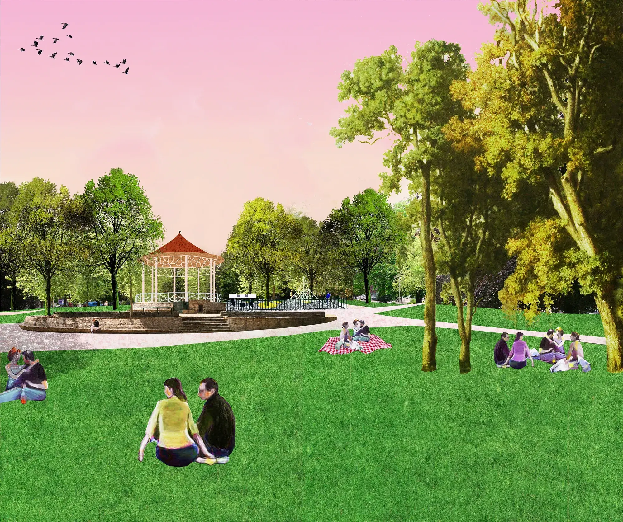 Le parc abrite une aire de jeux pour enfants, des espaces de pique-nique et plusieurs œuvres d’art en plein air qui rappellent le riche passé culturel de la ville.